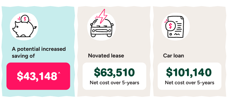 A novated lease could stack up to thousands of dollars in tax savings each year, and for electric cars, the savings are even more epic. If you earn $90,000 a year and you’re keen on a Tesla Model 3, a 5-year novated lease could net you a cool saving of over $43,000^ compared to a car loan.